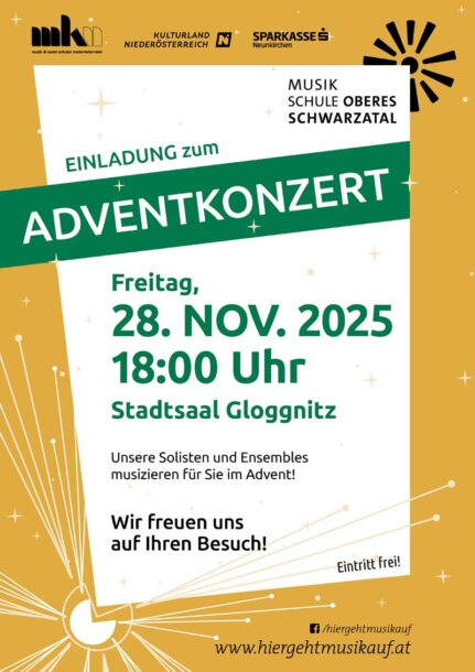 Am Freitag, den 28. November 2025, stimmen Sie unsere SchülerInnen im Stadtsaal Gloggnitz um 18:00 Uhr bei unserem Adventkonzert musikalisch auf die Adventzeit ein.