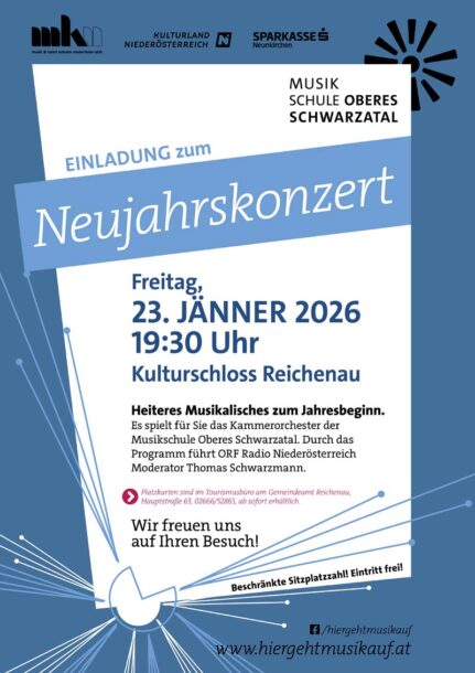 Am Freitag, den 23. Jänner 2026, findet um 19:30 Uhr das traditionelle Neujahrskonzert mit dem Kammerorchester der Musikschule Oberes Schwarzatal unter der Leitung von Florian Wilscher im Kulturschloss Reichenau an der Rax statt.