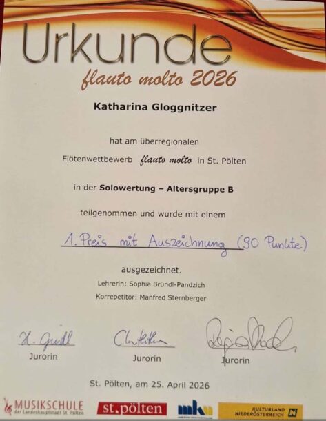 Katharina Gloggnitzer nahm am Samstag, den 25. April 2026 am Flauto-Molto-Wettbewerb in St. Pölten in der Solowertung Querflöte – Altersgruppe B teil und erspielte einen 1. Preis mit Auszeichnung.
